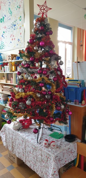 LE SAPIN DE NOËL DE LA CLASSE: les garçons ont mis les guirlandes et les filles les boules!