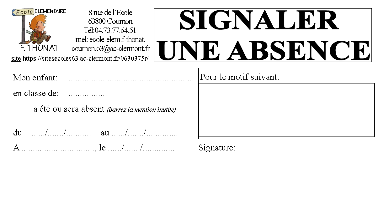 En cas d’absence, merci de prévenir l’école dès que possible et avant la rentrée en classe. (avant 8h20 / avant 13h20 ). Vous pouvez aussi laisser un message sur le répondeur.