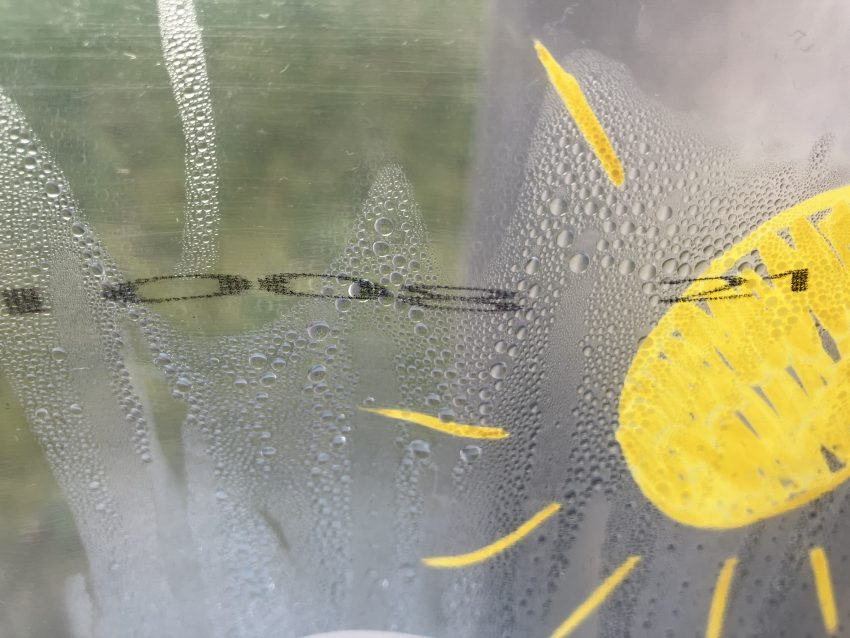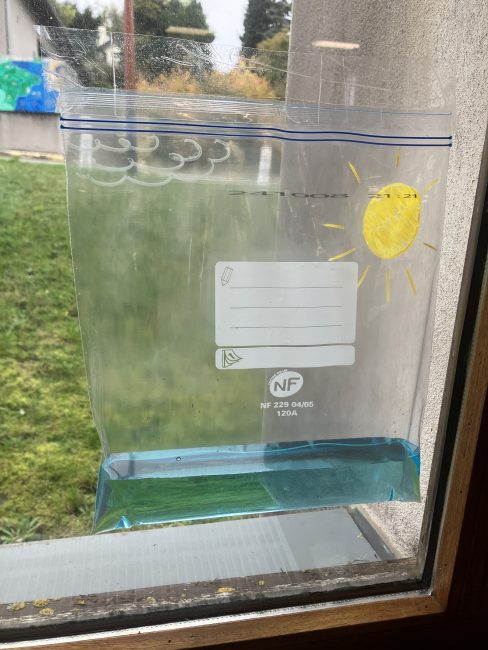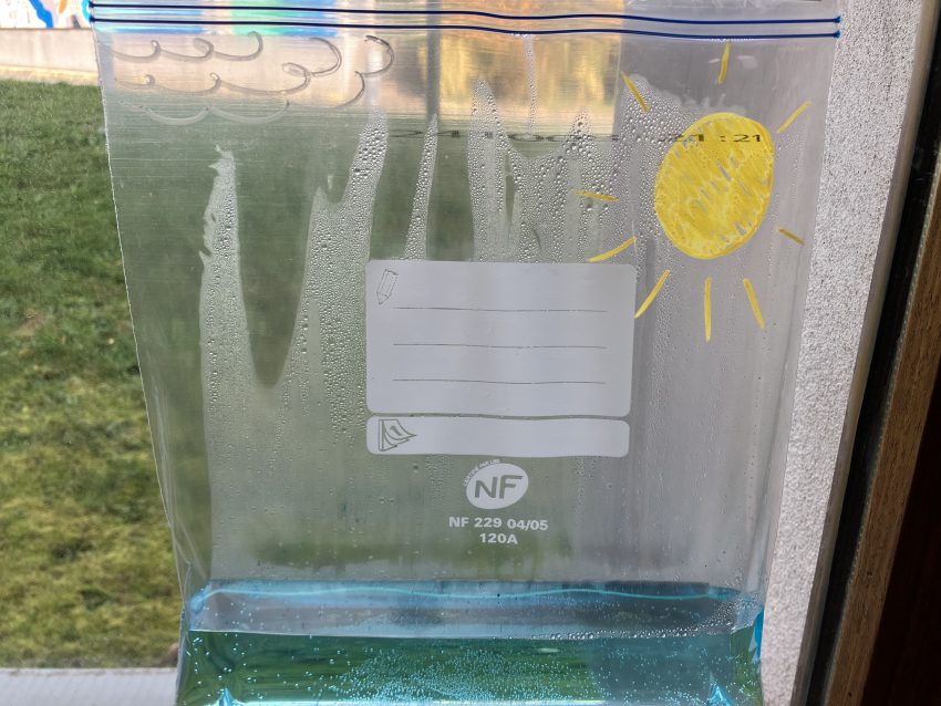 Mettre de l’eau au fond d’un sac congĂ©lation zippĂ© et le disposer sur une vitre au soleil ou au-dessus d’un radiateur. On peut observer les Ă©tapes du cycle de l’eau : Ă©vaporation, condensation, prĂ©cipitation (l’eau coule le long du sac), collection (le niveau de l’eau ne baisse pas).