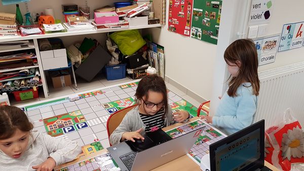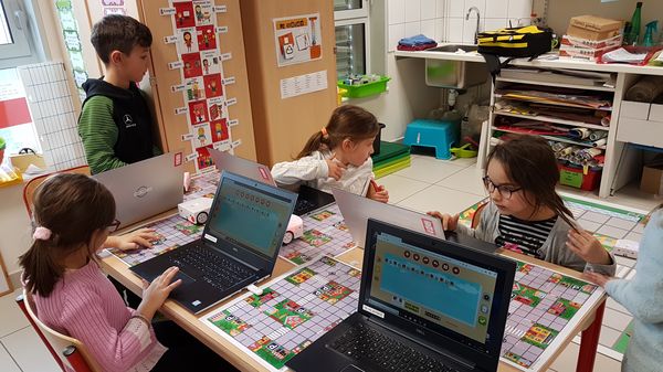 Le réseau Canopé nous a prêté 5 petits robots Thymio et 5 ordinateurs portables pour les piloter. Le but est de s’initier à la programmation et de travailer les déplacements dans l’espace notamment la notion gauche/droite.