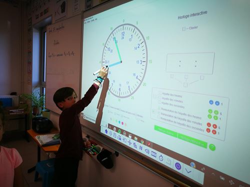 Nous avons la chance d’avoir un tableau numérique interactif et pour apprendre à lire l’heure, c’est très pratique.