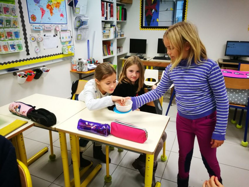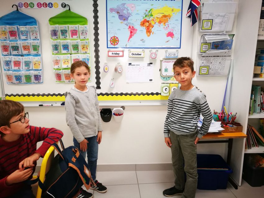 Louise et Lucas jouent leur dialogue en anglais pour faire la date, la météo, compter les jours d’école…