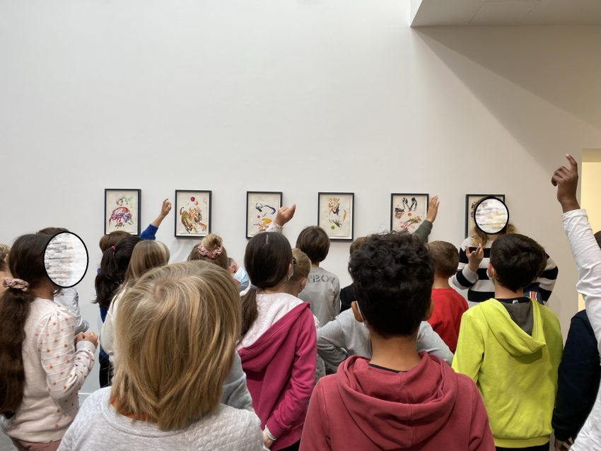 Mathilde, notre guide, nous a expliqué qu’un jour qu’elle se promenait dans Paris, au bord de la rue, elle a trouvé une marionnette. Elle l’a trouvée très moche ! Quand elle faisait ses tableaux, elle pensait à la marionnette, et elle l’a peinte sur certains.