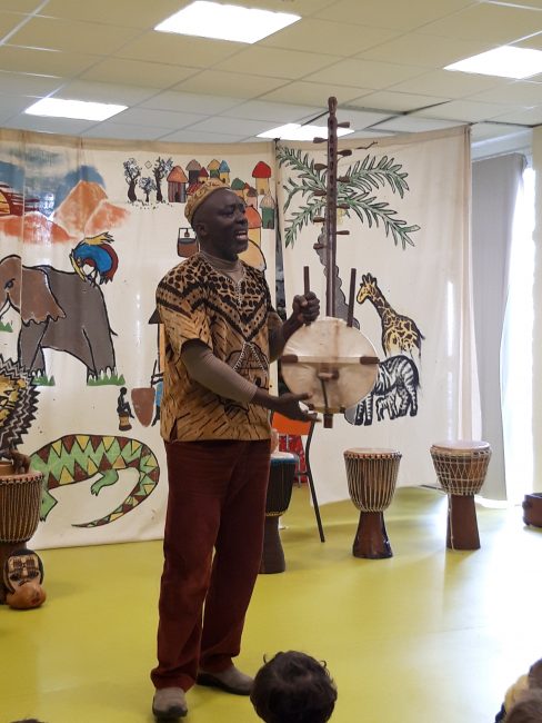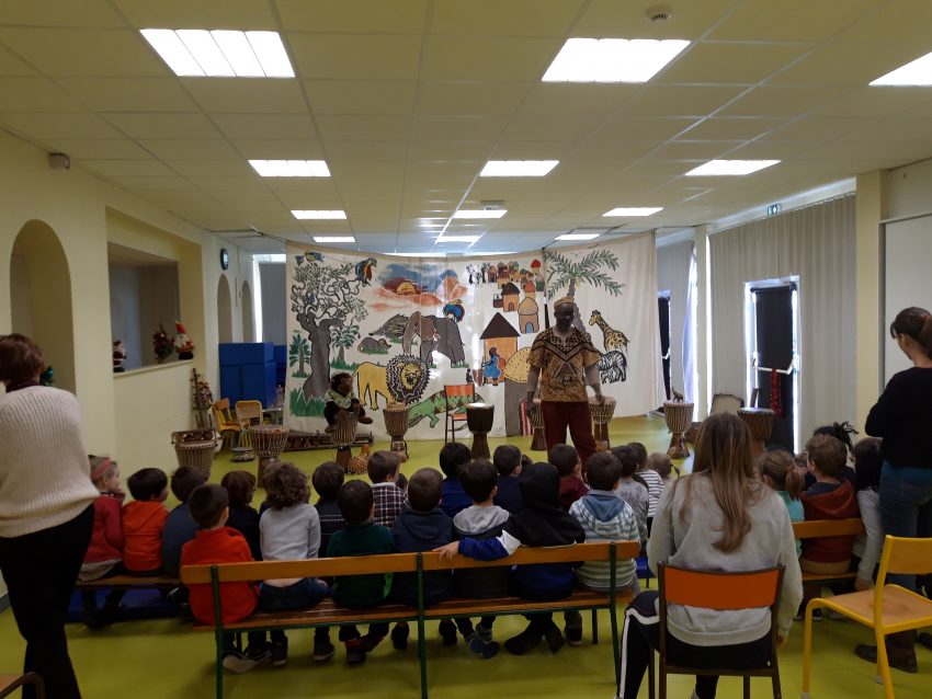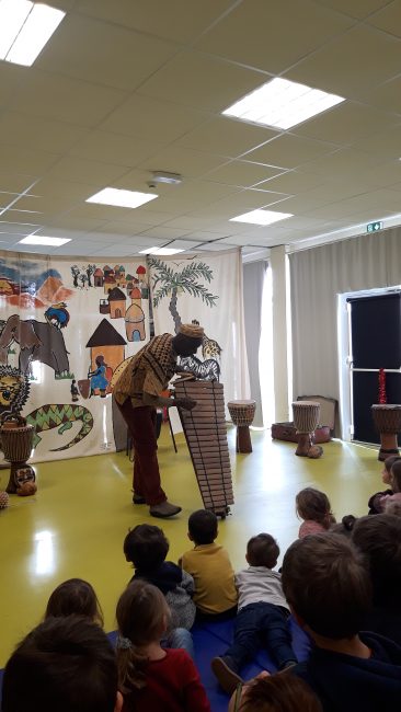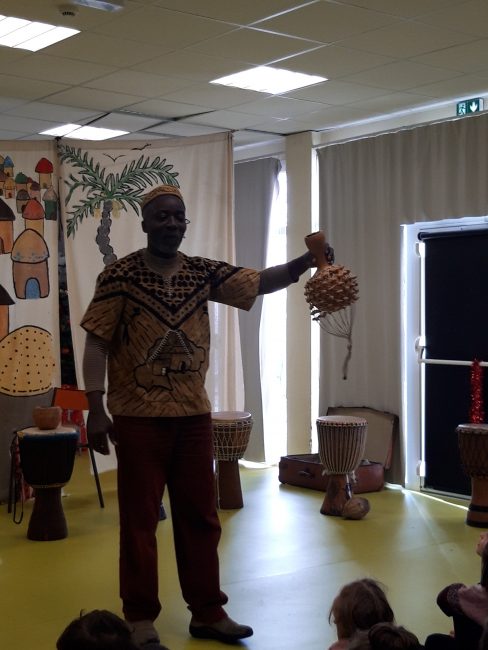 Nous avons reçu la visite d’un conteur Africain ce vendredi matin. Les classes ont assisté à ce spectacle 2 par 2. Dans un premier temps il nous a raconté 2 contes. Le premier évoquait la relation d’amitié entre une petite fille Anta et le ciel. Puis il nous a expliqué pourquoi la grenouille avait les fesses plates…