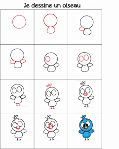 Maintenant que tu as compris ce qui caractérise un oiseau (2 pattes / 2 ailes / des plumes / un bec et ils pondent des œufs ), dessines-en plusieurs en n’oubliant aucun détail!