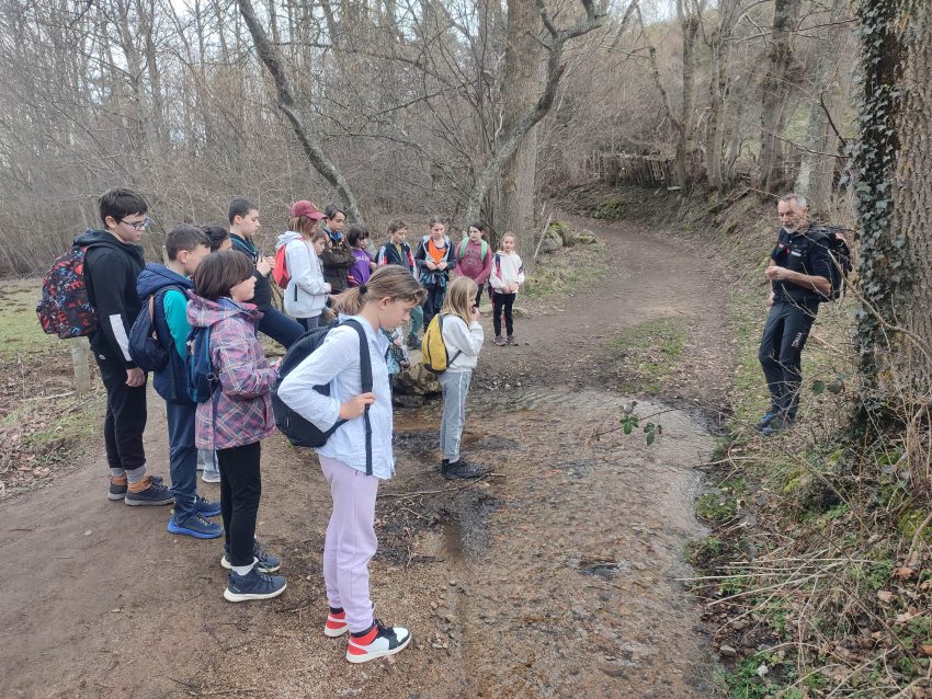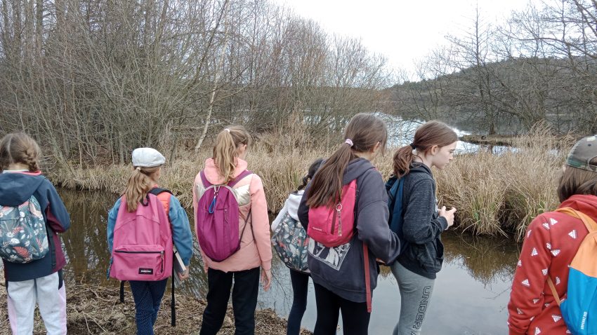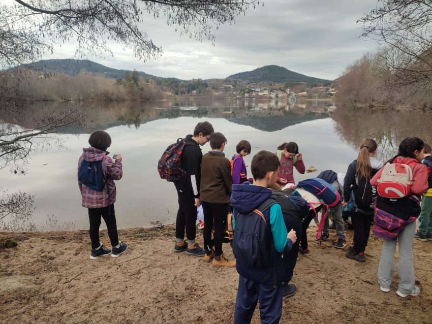 20 000 000 dâannĂ©es, il y avait une chaĂźne de montagnes en granit qui sâappelait Hercynienne. A cause de lâĂ©rosion, elles ont quasiment disparues en formant un plateau qui sâest ensuite fracturĂ© en plusieurs plateaux. Avant, le lac Ă©tait plus grand mais avec les rochers qui sont tombĂ©s, une partie du lac a Ă©tĂ© bouchĂ©e. Nous avons trouvĂ© un petit cours dâeau, Michel, lâanimateur, nous a expliquĂ© quâil ne fallait pas en boire car il y a des microbes dedans.