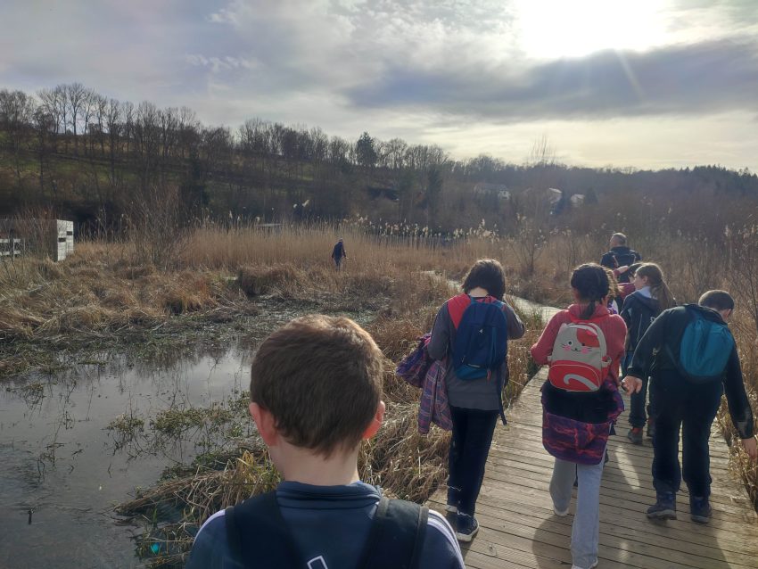 Nous avons appris que le lac faisait 66 hectares et que sa zone humide faisait 1,6 hectares. Nous avons commencĂ© par prendre une grande passerelle qui traversait la zone humide. Nous avons continuĂ© notre chemin jusquâĂ un observatoire oĂč nous avons vu un canard đŠ, une Ă©crevisseđŠâŠ