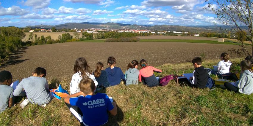 Nous avons d’abord appris à lire le paysage : premier plan, arrière-plan, éléments naturels, éléments créés par l’homme, plaine, montagne, plateau, etc. Les enfants ont appris à tracer les grandes lignes, puis le dessin rapide au crayon.