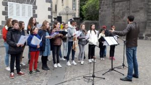 A 10h, les élèves de CM2 avec les élèves de la classe artistique du collège Michel de l’Hospital ont chanté pour les 50 ans du jumelage entre Riom et Nördlingen.
