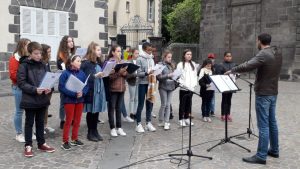 A 10h, les élèves de CM2 avec les élèves de la classe artistique du collège Michel de l’Hospital ont chanté pour les 50 ans du jumelage entre Riom et Nördlingen.
