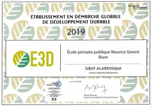 Cette démarche peut désormais faire l’objet d’une labellisation nationale. Le label E3D permet d’associer toutes les parties prenantes de l’école (enseignants, élèves, parents d’élèves) et les partenaires engagés dans la démarche, notamment les collectivités territoriales (Mairie, service périscolaire).